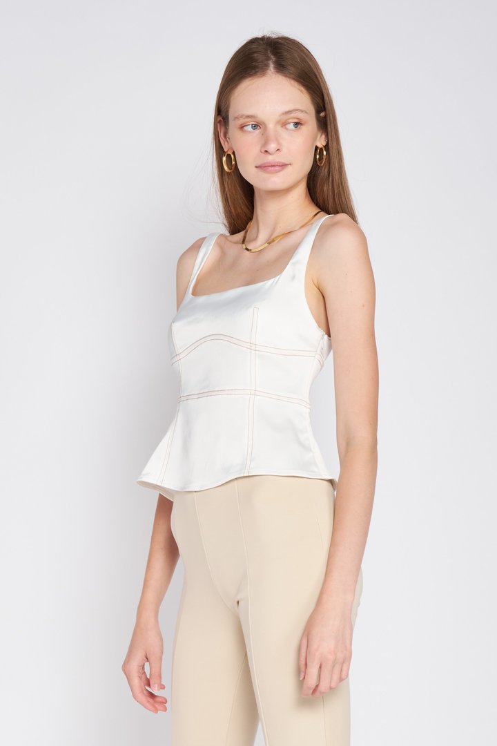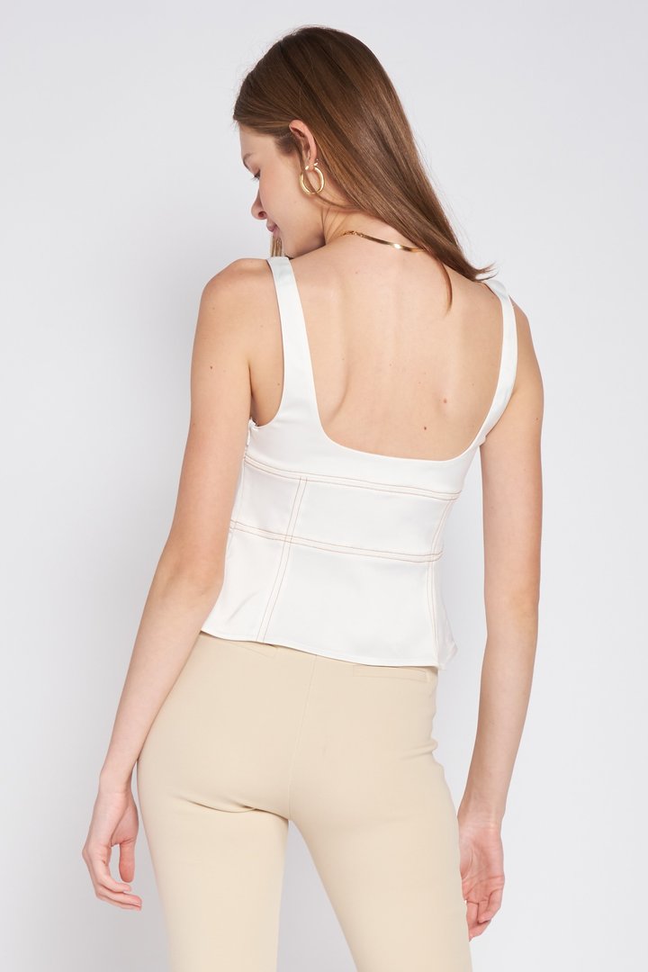 Sleeveless bustier top, square neck in white color.