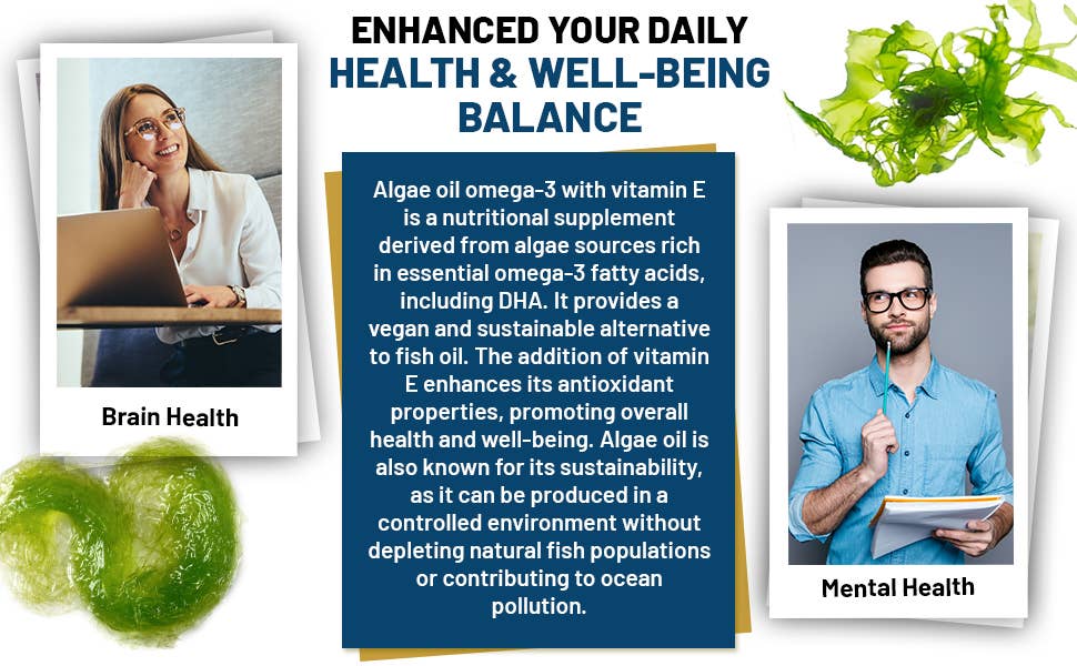 VEGAN OMEGA 3 - Our high-quality algae Omega-3 supplement is the best value choice for vegans and vegetarians who want to enjoy the benefits of Omega-3 fatty acids without compromising their lifestyle. SUSTAINABLE - Our capsules are made from sustainable algae oil, which is a plant-based source of DHA. It has been produced in a controlled environment without depleting natural fish populations or contributing to ocean pollution. ADDED VITAMIN E - Vitamin E can improve the absorption of omega-3 DHA. When omega-3 DHA is taken orally, it is not always absorbed well. Vitamin E can help to improve the absorption of omega-3 DHA, which can increase its bioavailability and make it more effective.