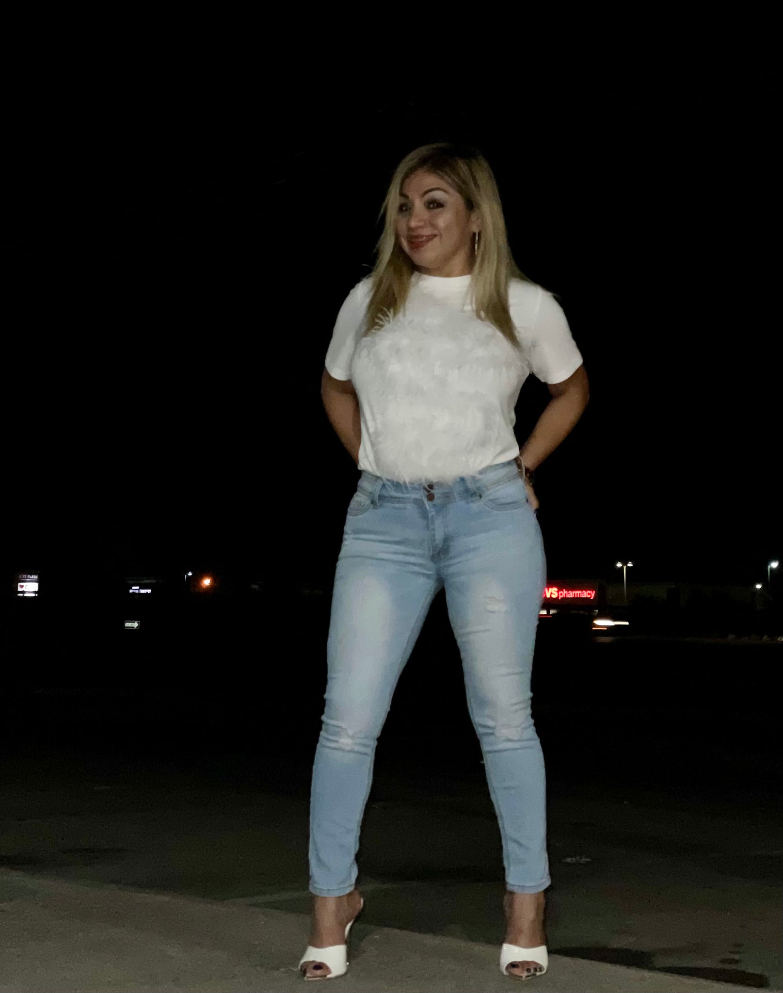 This feather embellished t-shirt pairs with pretty much anything in your wardrobe. You can pair it with shorts, jeans, leather pants or skirt. T-shirt has short sleeves, a round neck, a straight hem and feather embellishments.